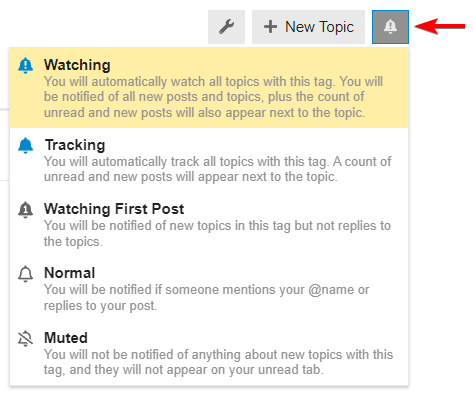 Wenn du dich gerade auf einer Kategorie- oder Tag-Seite befindest, für die du bereits eine Benachrichtigungseinstellung hast, kannst du sie auch direkt ändern: Klicke auf das Glocken-Symbol neben dem Button „Neues Thema“.